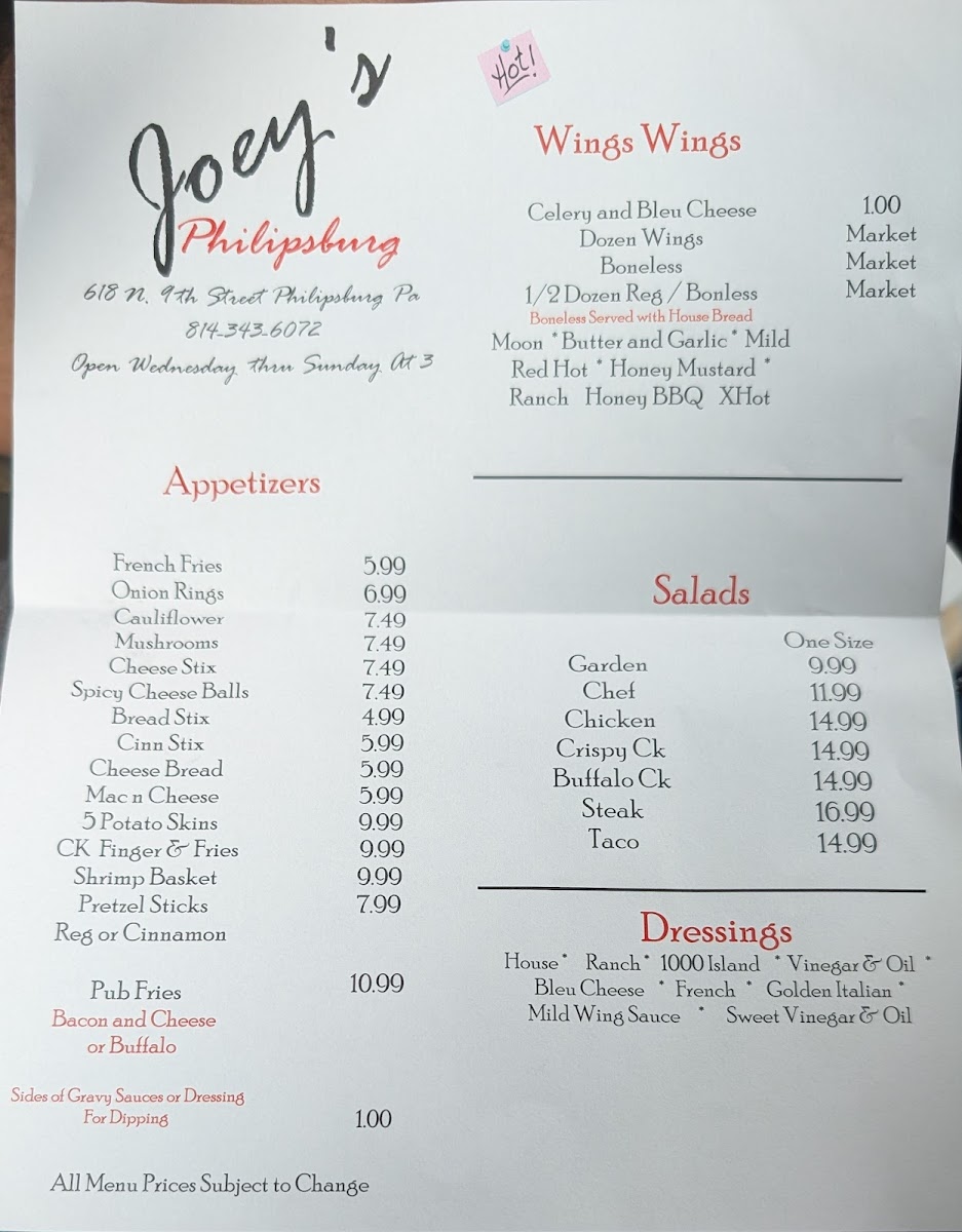 The menu at Joey's To Go offers a straightforward selection of familiar and comforting favorites, perfect for casual meals and quick bites. Whether you're stopping by for a hearty pizza, a basket of crispy chicken wings, or simple snacks like fries and onion rings, the options invite easy enjoyment without fuss.